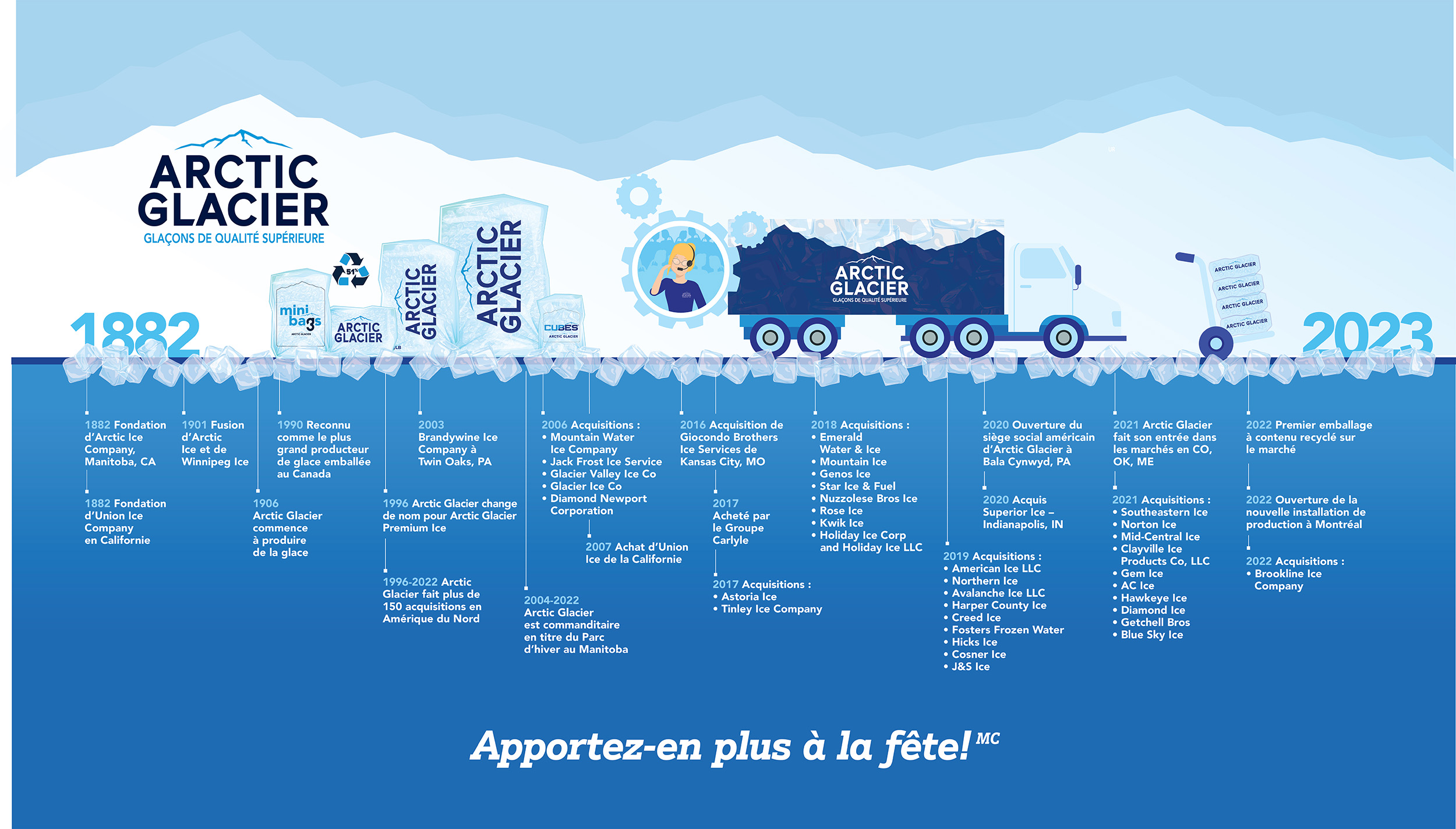 Au cours de ses 100 premières années d’activité, Arctic Ice a continué d’évoluer, s’imposant comme le plus grand fabricant de glace au Canada, employant 800 associés, bénéficiant d’une flotte de plus de 400 camions et livrant annuellement plus de 100 millions de sacs de glace partout en Amérique du Nord.